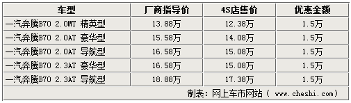 北京個各展廳內09款奔騰B70現(xiàn)車充足,店內現(xiàn)車近段時間優(yōu)惠幅度較大,全系車型均可以給出1.5萬元的優(yōu)惠,相比前一段時間的1.1萬元優(yōu)惠幅度有所提升。現(xiàn)階段銷售較快的型號主要是2.0L的導航版車型,以及2.3L高配的兩款車型。