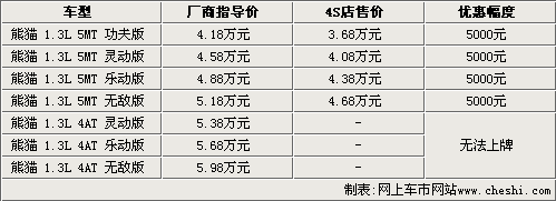 熊貓系列產品是吉利旗下的首款微型轎車,與比亞迪F0、奇瑞QQ3等車型分羹微型轎車市場。熊貓系列在前段時間又推出了自動擋車型,進一步加大了這款車型的市場競爭力。網上車市網站近日了解到,熊貓系列手動擋車型有了更多的優惠幅度,全系均可優惠5000元,而已上市的自動版車型則仍無法進入北京市場。
