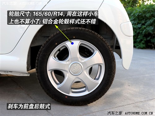 說實話微型車輪轂好看的還真不是很多,畢竟尺寸在那兒擺著呢,能做出來的花樣有限,更何況還有成本這只利劍懸在頭上,所以小型車的輪轂基本上沒有太復雜了,首先要滿足實用性的需求,有的車型甚至只有鋼輪轂加裝飾蓋,有的鋁合金輪轂造型你可能都不愿再看第二眼,所以在微型車中找一款好看的輪轂相當不容易,好在比亞迪F0的輪轂比較有特色。