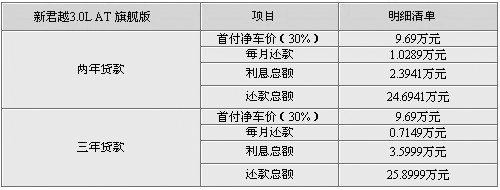 貸款詳解:新君越新上市不久,目前仍需要加價提車,現(xiàn)在實行的分期付款購車,分為兩年及三年付款兩類,買車的朋友可以根據(jù)自己的實際能力選擇貸款項目。首付款為凈車價的三成,也就是在9.69萬,當(dāng)然編者所列的車型是新君越的最高配,按照比例來計算的話其它版本的車型首付款要低于9.69萬。