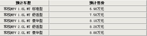 依照江淮汽車的定價(jià)規(guī)則,和悅MPV很有可能采用同悅的定價(jià)特點(diǎn),預(yù)計(jì)會(huì)推出1.8L、2.0L兩個(gè)排量共計(jì)五款車型。另外,和悅MPV的入門級(jí)車型很有可能會(huì)定下較低的價(jià)格,使該系列產(chǎn)品擁有一個(gè)低價(jià)的宣傳策略,往往這種入門級(jí)低配車型很難銷售,或者是根本無車銷售。從同悅的配置價(jià)格差異來看,和悅MPV的價(jià)格區(qū)間應(yīng)該會(huì)定在6.98-8.88萬元左右。除了6.98萬元的入門級(jí)車型,和悅MPV同排量的舒適型和豪華型價(jià)格相差6000元左右,而同配置不同排量的兩款車的價(jià)格差應(yīng)該在7000元左右。