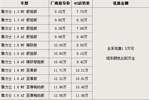 據廣汽豐田北京地區4S店銷售人員介紹,現在購買雅力士車型全系優惠現金1.5萬元。目前雅力士1.3排量和1.6排量均有現車供應,現車顏色以黑色、紫色、銀色為主。北京地區各4S店由于訂單不同,各店銷售的現車顏色有所不同。