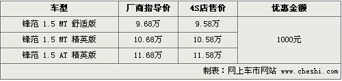 據(jù)4S店銷售人員介紹,目前鋒范1.5排量有現(xiàn)車供應(yīng),主要顏色有銀色/紅色/灰色等外觀,車價(jià)方面優(yōu)惠并不多,只有1000元。部分款顏色還需要預(yù)訂。