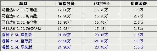 全新馬自達睿翼在今年4月份正式上市,睿翼在繼承了老款馬自達6車風格同時,在外觀和內飾上帶給消費者耳目一新的感覺。近日我們從一汽馬自達官方獲悉到,睿翼2.0車型將于10月22日正式上市。與此同時我們從北京地區一汽4S店獲悉到,首批2.0同時根據網上車市價格檢測系統顯示,2.5排量的睿翼和老款馬自達6均出現了較大的優惠。具體車型及售價見下表。馬自達排量的睿翼將于10月底到店,預計售價將在18-20萬元之間。目前各4S店全面開始接受預定,訂金1000元。