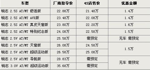 目前銳志全系車型最高優惠可到1.6萬元。目前優惠后的最低售價僅為21.48萬元,其中現車主要是2.5S版車型,2.5V部分車型需要預訂,訂金需要交納5000元。最快11月才能提車。