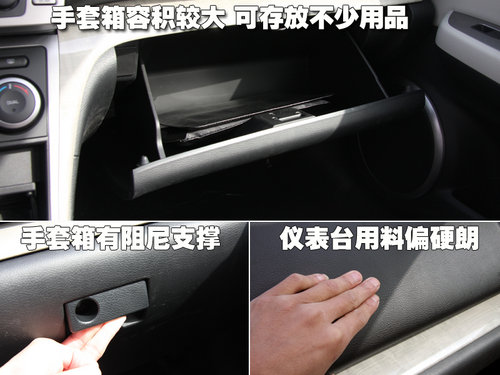 副駕駛位置的手套箱帶有阻尼設計,打開時不會因重力自由下落,同時大容積手套箱能夠滿足車主日常放置常用物品的需求。儀表臺表面用料偏硬朗,但接縫十分勻稱。