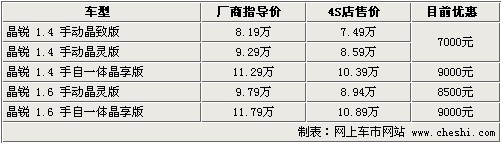 據4S店銷售人員介紹:目前晶銳全系最高優惠達9000元,最低僅售7.49萬。晶銳目前各店內現車較少,只有個別車型有現車,如需預定需等待1個半月時間。價格方面,如到店內洽談可獲得更高優惠。1.4升手動車型優惠幅度,由原來的6000元增至7000元,而1.4升與1.6升自動擋車型已優惠9000元,相比之前的6000元增幅達33.3%。