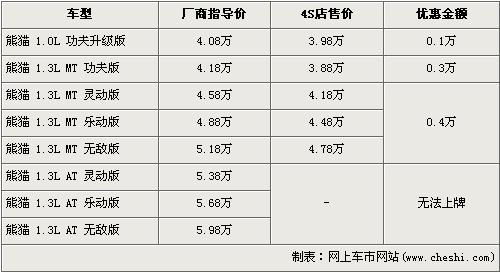 據(jù)吉利汽車4S店銷售人員介紹,吉利熊貓近期有最高4000元的優(yōu)惠。新推出的1.0L車型優(yōu)惠為1000元,售價(jià)降到了3.98萬元。1.3L手動(dòng)功夫版優(yōu)惠3000元,售價(jià)降到了3.88萬元,其他手動(dòng)擋車型優(yōu)惠4000元。由于熊貓1.3L自動(dòng)檔車型尾氣排放不合格,所以無法在北京上牌照。銷售人員還介紹,目前1.0L車型較緊張,1.3L車型現(xiàn)車充足。