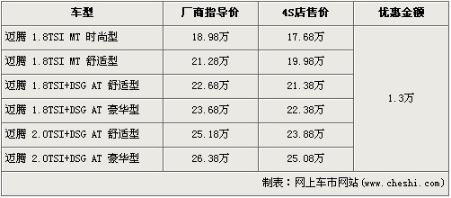 據(jù)北京一汽大眾經(jīng)銷店銷售人員介紹,邁騰全系車型全系優(yōu)惠1.3萬元。經(jīng)1.3萬元的優(yōu)惠后,全系入門級的1.8TSI MT時(shí)尚型的售價(jià)從18.98萬元下降到了17.68萬元。全系最高配的邁騰2.0TSI豪華版經(jīng)1.3萬元優(yōu)惠后,售價(jià)降到了25.08萬元。銷售人員還介紹,目前邁騰全系現(xiàn)車都比較充足。