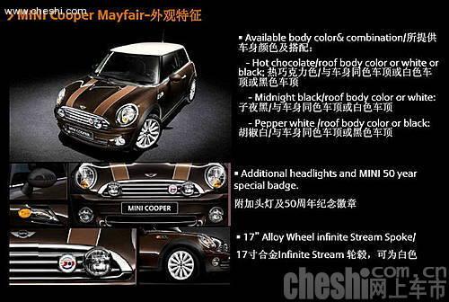 MINI 50 Mayfair紀念版車型在配置上較MINI Cooper 1.6高配車型有所提升,運動真皮方向盤、電動折疊外后視鏡、發動機艙蓋褐色飾條、倒車雷達及自動大燈控制等均稱為MINI 50 Mayfair紀念版車型標準配置。