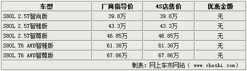 據4S店銷售人員介紹,目前國產2010款S80L全系車型已經到店,處部分顏色無車需要消費者訂車,訂金為5萬元;除此之外全系車型基本可以滿足購車需要。2010款車型中,有三款車型因增配而在價格上相比09款車型有所提升。