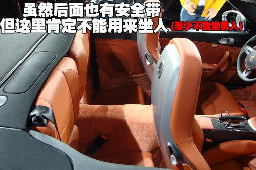 2010款保時捷911 Turbo敞篷版前排座椅為一體式運動型座椅,支撐有力且皮質手感舒適。除座椅下方的電動調節按鈕外,在椅背側面還設計了手動扳手,從而方面后排乘客上下車。由于雙后座受到流線車體縮減的局促空間,并不適合體型略壯碩的成人長途乘坐。
