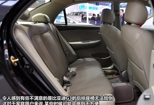 不過除了內部做工值得肯定外,比亞迪G3也有不太令人滿意的地方。首先其車身外形的做工在某些細節上還略顯瑕疵,比如這輛展車的后備箱接縫明顯比合資車型要松散一點,而鈑金的精細程度也有可以提高的空間。最后有些令人感到意外的是比亞迪G3的后排座椅居然無法放倒,這對一款家用車型來說,也許會在日常使用時感到有些不便。
