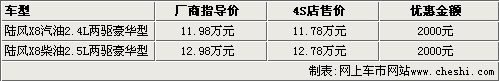 9月17日,陸風(fēng)首款城市型SUV正式在江西南昌發(fā)布上市,共推出兩款車型,分別是豪華汽油版和豪華柴油版,其中汽油版售價11.98萬元,而柴油版售價12.98萬元。目前陸風(fēng)X8雖然已經(jīng)正式上市,但在4S店出現(xiàn)車還不全,現(xiàn)金優(yōu)惠2000元。