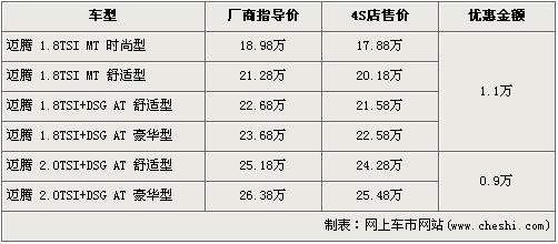 據北京一汽大眾經銷店銷售人員介紹,邁騰全系車型全系優惠1.1萬元。經1.1萬元的優惠后,全系入門級的1.8TSI MT時尚型的售價從18.98萬元下降到了17.88萬元。全系最高配的邁騰2.0TSI豪華版經9000元優惠后,售價降到了25.48萬元。銷售人員還介紹,目前邁騰全系現車都比較充足。