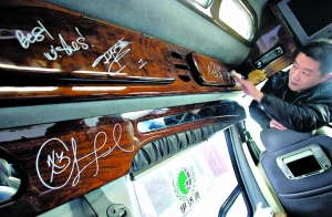 記者看到,深褐色的車身內,除了車身正后方劉德華的中文簽名外,其他清一色都是球星們的英文簽名,其中火箭隊的麥蒂還寫了“Best wishes”的祝福。作為這輛車的“御用司機”,白先生少不了和這些明星“面對面”,他也講述了每個明星簽名背后的故事。
