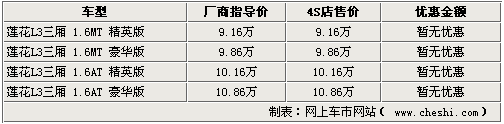 青年蓮花4S店銷售人員表示,現在到店的蓮花L3車型顏色不是很全,但是很快將充足貨源,屆時將可滿足消費者的購車需要。現階段各家店內的三廂蓮花L3新車均維持廠商指導價,暫時沒有任何現金優惠,如需預訂店內沒有的顏色,則要提前預訂并等待半個月左右即可提車。