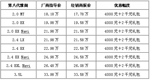 新雅閣,自誕生之日起就打著“史上最強(qiáng)雅閣”的旗號,10月更是一舉奪得昆明中級車上牌量亞軍,其實(shí)力不容小覷。近日,車天下編輯從廣本梁源店獲悉,自2009年12月14日至12月31日購置雅閣車型即可享受4000元?dú)q末現(xiàn)金優(yōu)惠以及2000元店慶購車禮包。具體車型及詳細(xì)優(yōu)惠政策,如下表: