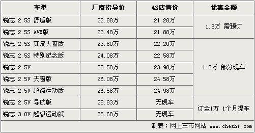據(jù)一汽豐田4S店銷售人員介紹,目前銳志可優(yōu)惠1.6萬元,現(xiàn)車比較齊全,一般購買車型主要集中在舒適版和紀念版,消費者可根據(jù)需要選購。另據(jù)介紹,新銳志車型要在明年4月北京車展亮相,之后2個月左右才可以購買到,并且新款車型剛上市不會有現(xiàn)款這么大的優(yōu)惠空間,目前購買現(xiàn)款銳志也是一個不錯的選擇。如消費者有意購買,到店詳談會有更優(yōu)惠的價格。北京地區(qū)各4S店由于訂單不同,各店銷售的現(xiàn)車顏色有所不同。