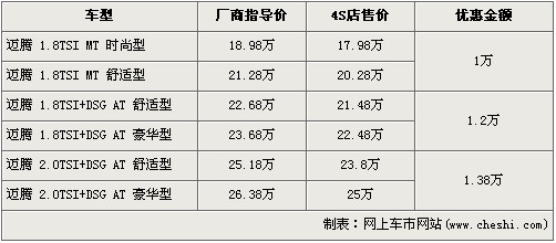 據一汽大眾經銷店銷售人員介紹,邁騰全系車型全系最高優惠1.38萬元。經1萬元的優惠后,全系入門級的1.8TSI MT時尚型的售價從18.98萬元下降到了17.98萬元。全系最高配的邁騰2.0TSI豪華版經1.38萬元優惠后,售價降到了25萬元。銷售人員還介紹,目前店內邁騰全系有現車。