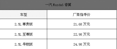 2009年4月12日,一汽馬自達宣布Mazda6睿翼正式上市。初期上市的Mazda6睿翼只有2.5L排量的三款車型可以選擇,售價在21.68-24.98萬元,即日起全國140家一汽馬自達4S店就可以接受預訂,首批新車將于4月25日到達展廳。