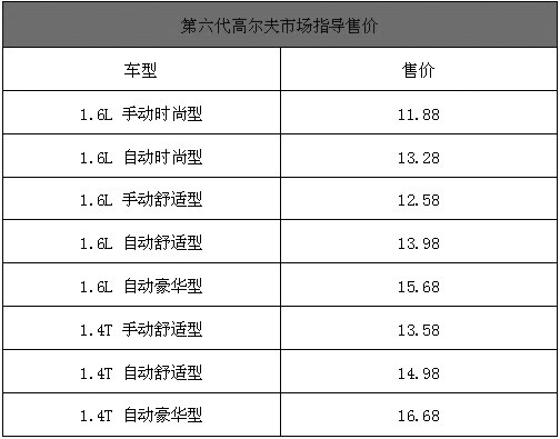 2009年10月19日,結(jié)束了歐亞大陸的長(zhǎng)途跨越,完成了對(duì)完美城市的探尋與交融,人們期待已久的第六代高爾夫終于在長(zhǎng)春正式宣布上市。第六代高爾夫共推出了1.6L和1.4TSI兩種排量、八款車型供消費(fèi)者選擇,兩種排量的發(fā)動(dòng)機(jī)都可匹配7速DSG雙離合自動(dòng)變速箱和5擋手動(dòng)變速箱,售價(jià)11.88萬(wàn)-16.68萬(wàn)元,具體售價(jià)如下表:第六代高爾夫市場(chǎng)指導(dǎo)售價(jià)