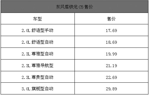 2009年11月23日,在第七屆中國國際汽車博覽會上,備受矚目的09年B級車市壓軸之作,東風雪鐵龍品牌戰略旗艦車型C5正式公布價格。東風雪鐵龍C5共有2.0L、2.3L和3.0L三種排量,四種級別可供選擇,其價格區間為17.69萬-29.89萬元。從即日起,全國各指定銷售網點開始接受預訂,首批展車也將陸續到店,并于2010年1月初正式交付。