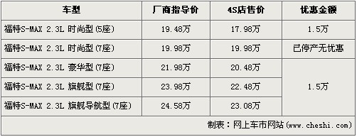 據(jù)北京福特4S店銷售人員介紹,店內(nèi)在售的福特S-MAX有1.5萬元的現(xiàn)金優(yōu)惠,并且7座的時尚版車型已經(jīng)停產(chǎn)。經(jīng)1.5萬元優(yōu)惠后,2.3L豪華版、旗艦版、旗艦導航版的售價分別降為了20.48萬元、22.48萬元和23.08萬元,入門級的5座時尚型售價降到了17.98萬元。