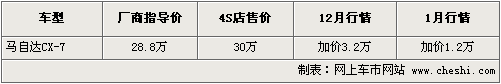 據一汽馬自達4S店銷售人員介紹:CX-7自上市起一直加價3.2萬元,近期該車型加價所有降低,提現車需加價1.2萬元,日前店內有黑色及銀色現車供應,購車可贈送貼膜、倒車雷達等裝飾。如消費者有意購買,到店詳談會有更優惠的價格。北京地區各4S店由于訂單不同,各店銷售的現車顏色有所不同。
