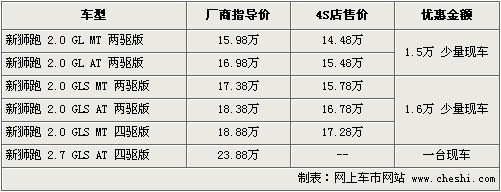 據(jù)東風(fēng)悅達(dá)起亞4S店銷售人員介紹,目前獅跑2.0車型高配車型優(yōu)惠1.6萬(wàn)元,低配車型優(yōu)惠1.5萬(wàn)元,其中2.0兩驅(qū)最低售價(jià)14.28萬(wàn)元,目前自動(dòng)檔現(xiàn)車不太齊全,部分車型顏色還是需要預(yù)訂,訂金為2千元,最快半個(gè)月內(nèi)可以提到車。另外如購(gòu)買2.7車型到店詳談會(huì)有更高的優(yōu)惠幅度。另?yè)?jù)介紹,少量的現(xiàn)車中已加入導(dǎo)航、倒車影像系統(tǒng)等配置,價(jià)格方面也有所增加。如消費(fèi)者有意購(gòu)買,到店詳談會(huì)有更優(yōu)惠的價(jià)格。北京地區(qū)各4S店由于訂單不同,各店銷售的現(xiàn)車顏色有所不同。