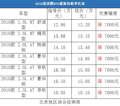 近日,編輯從北京地區(qū)綜合經(jīng)銷商處了解到,奔騰B70有黑色、銀色和灰色現(xiàn)車,基本上可以滿足消費者的需求,如果購車需要預(yù)定,等待半個月左右就可以提車;目前購車全系有7000元的現(xiàn)金優(yōu)惠。據(jù)經(jīng)銷商透露,消費者要想以這個價格提車,需要在店內(nèi)做一條龍服務(wù),其中車輛四項基本保險可以打8.5折(約合4200-5500元左右)。以下是奔騰B70最新價格變化表: