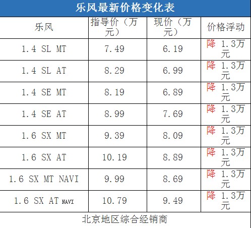 樂風SL車型與SE車型的差價為7000元,在配置上SE車型增加了車內中控鎖、遙控鑰匙、后視鏡電動調節和音響揚聲器;作為一款主打性價比的小車而言,基本款的樂風就可以滿足一般家用消費者的需要。而樂風1.6L排量車型的定價在小型車中不論是從性能還是從配置上來說競爭力都不明顯。