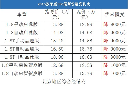 近日,編輯從北京地區綜合經銷商處了解到,榮威550的現車充足,目前廠家推出了啟悅版和啟智版的賀歲版車型,除了賀歲版車型降價1000元外,其他車型均降價9000元。以下是榮威550最新價格變化表: