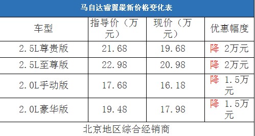 近日,編輯從北京地區一汽馬自達4S經銷商處了解到,睿翼的2.0L車型和2.5L車型都有現車在售,2.5L車型在4S店的優惠為8000元,而上市不久的2.0L車型只有禮包贈送。相比之下,綜合經銷商處的馬自達睿翼優惠幅度非常大,2.5L車型已經跌破了20萬元,2.0L車型也有了1.5萬元的現金優惠。以下是馬自達睿翼最新價格變化表: