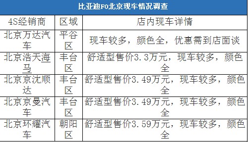 從調查的結果來看,各4S店內,比亞迪F0現車數量均比較充裕,可選的顏色也比較全,隨時到店均可提車。價格方面,比亞迪F0的優惠還是比較大的,以售價為4.09萬元的F0舒適型為例,大部分的4S都報出6000元的現金優惠,其中北京浩天海馬的報價最低,僅為3.3萬元,為全北京市最低價格。不過經銷商表示,該價格隨時都有上漲的可能。
