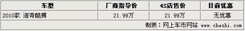 據道奇4S店銷售人員介紹:目前2010款道奇酷搏北京地區無現車,但部分4S店內接受預訂,定金為5000元。據經銷商介紹,2010款酷搏計劃將在第二季度引入中國,但最早可能在3月份到店銷售。2010款酷搏仍將搭載2.0升自然吸氣發動機,在配置上將與08款車型相差不多,相比09款車型配置更豐富;此款車型售價為21.99萬元,在價格方面與老款車型持平。