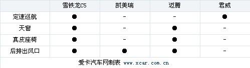 總的來看C5的配置單還是比較有誠(chéng)意的,基本能做到“人無我有”。比較尷尬的是凱美瑞,作為一款2.4L,價(jià)格在20萬左右的中級(jí)車型,標(biāo)配里不含真皮座椅,也許會(huì)讓一部分消費(fèi)者望而卻步。