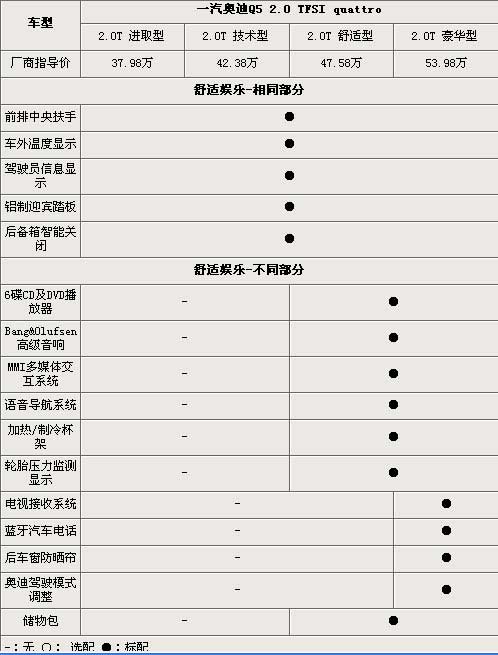 往往全系車輛的價(jià)格差異差的最多的就是在豪華娛樂配飾上面,奧迪Q5當(dāng)然也不例外。奧迪Q5舒適型以及豪華型配備了奧迪的第三代MMI多媒體交互系統(tǒng),通過精簡控制器,MMI可以迅速、方便、直觀地使用大量的功能和技術(shù)。播放器選用了帶有DVD功能的6碟CD系統(tǒng),而音響也是選用了丹麥的頂級音響品牌Bang&Olufsen,綜上幾個(gè)配置,都是在進(jìn)取型以及技術(shù)型上看不到的配置。頂配的豪華版車型,相比其他3款車型則多了電視接收系統(tǒng)、藍(lán)牙汽車電話等高科技味道十足的娛樂設(shè)備,而可以調(diào)節(jié)減震阻尼軟硬的奧迪駕駛模式系統(tǒng),也是只在頂配的豪華版車型上共享的。