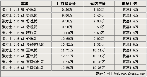 雅力士是一款在國內非常受歡迎的A0級小車,從這款車的配置、安全性方面,都是一款值得購買的小車。根據網上車市價格監測系統顯示,近期雅力士最高優惠1.6萬元,目前有部分型號的現車供應。具體車型行情如下: