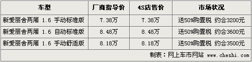 東風(fēng)雪鐵龍愛(ài)麗舍從9月份開(kāi)始,對(duì)車型進(jìn)行了一次全面升級(jí)。2010款新愛(ài)麗舍在安全、舒適、節(jié)油和性能方面比老款有增加了相應(yīng)的配置,進(jìn)一步強(qiáng)化了新愛(ài)麗舍成熟的產(chǎn)品品質(zhì)。而09款兩廂愛(ài)麗舍更具城市便利性,其備箱空間絲毫不亞于三廂車型,是繼富康后的又一經(jīng)典兩廂叫用車。根據(jù)網(wǎng)上車市價(jià)格監(jiān)測(cè)系統(tǒng)顯示,目前購(gòu)買(mǎi)愛(ài)麗舍兩廂,可享受購(gòu)置稅減半,折合最高優(yōu)惠約3600元。具體車型價(jià)格行情如下: