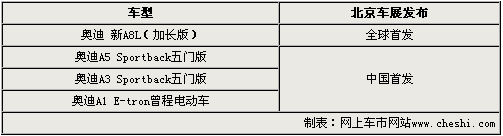 奧迪新一代A8車型雖然已于去年底正式發(fā)布,但其為中國消費(fèi)者量身訂做的加長版-新A8L將在國人面前全球首發(fā)。奧迪A5 Sportback五門版、奧迪A3 Sportback五門版車型,將于今年正式以進(jìn)口身份引入國內(nèi)。而奧迪A1 E-tron曾程電動車作為一款節(jié)能減排的概念車,將向人們展示其獨(dú)特的性能和環(huán)保技術(shù)。