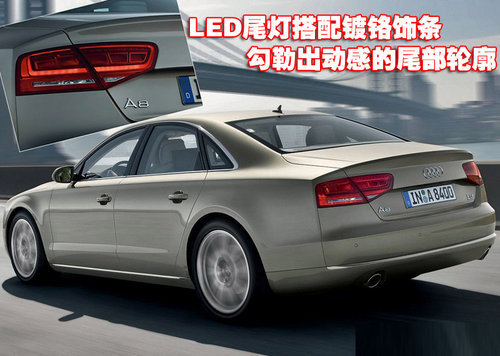 通過奧迪新A8車型的尾部可以看出,全新的LED分體式尾燈搭配全新后保險(xiǎn)杠的鍍鉻裝飾條,勾勒出其充滿活力與動感的尾部輪廓。