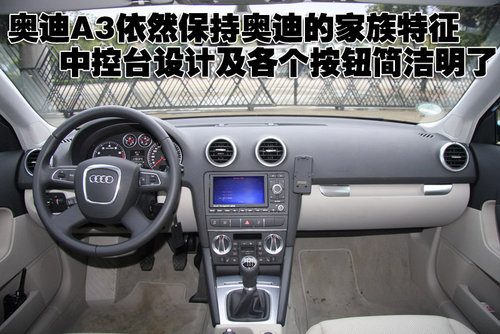 奧迪A3依然保持奧迪的家族特征,中控臺設計及各個按鈕簡潔明了。其三輻式真皮方向盤配備集成控制按鈕,而白色冷光儀表盤突出視覺效果的同時,又方便駕駛員讀取信息。