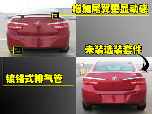 加裝配置的車型看起來時尚許多,譬如增加的鍍鉻式排氣管使整車更具運動感,與英朗GT極具運動感的外觀配合起來非常完美。當然,尾翼是少不了的。尾翼的增加不但看起來好看,尤其在高速駕駛中起到穩定車身的作用,是一個既美觀又實用的配置。