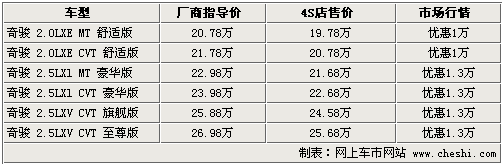 據北京地區東風日產4S店銷售人員介紹,目前奇駿2.0車型可以優惠現金1萬元,優惠后入門級車型售價跌入了20萬元價格區間,售價僅為19.78 萬,就是貨源相對比較緊張,訂貨周期在10個工作日左右。而2.5排量車型的貨源就相對比較充足,優惠幅度也比較大,達到了1.3萬元。另據4S店銷售人員介紹,奇駿全系車型中只有高配車型帶導航和行李架,用戶購車同時可以根據需要加裝相應的配置,經銷店內也有相應的套餐可供選擇,價格在1.2-1.6萬元之間。