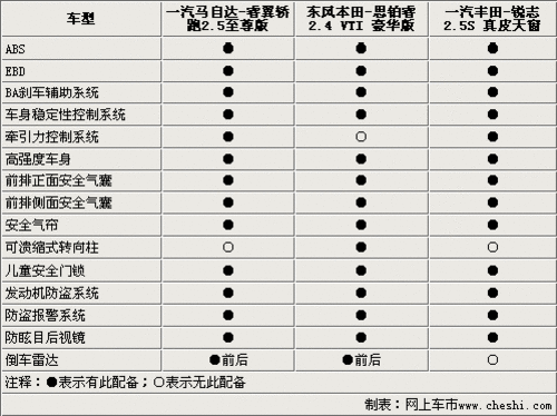 隨著汽車市場的日益成熟,安全能力逐漸也成為了車主最為關心的問題。可以看出ABS+EBD和6安全氣囊均成為了這三款車型的標準配置。但仔細看下來,睿翼轎跑和思鉑睿的配置還是更加的全面,在配備后倒車雷達同時還配備了前部停車雷達,,進一步保證停車時的安全。值得一提的是這三款車型都配備了車輛行駛動態控制系統,該項配置可以大大的降低車輛行駛中,因側滑而發生的事故,尤其是睿翼轎跑和銳志還配備了牽引力控制系統。在細節方面三款車同樣十分到位,都配備的后排兒童安全門鎖、防眩目后視鏡等。