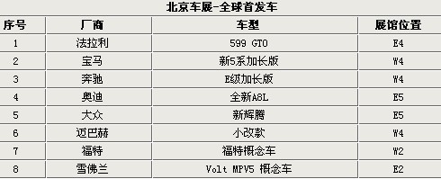 隨著中國汽車市場地位的日益提高,各大廠商越來越重中國市場,因此北京車展也引來了越來越多的全球首發新車。這屆北京車展將有8款新車全球首發,包含新5系Li和E級加長版,兩款新車將在車展后國產上市。大眾集團除了占據一個展館之外,也帶來了兩款全球首發新車,分別為全球A8L和新輝騰。