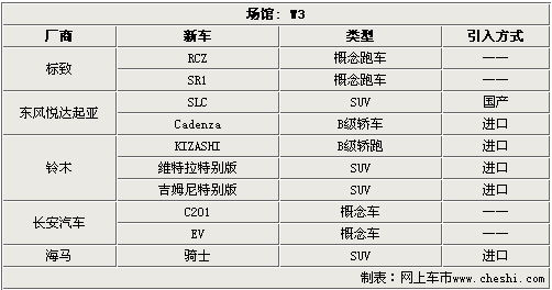 在W3館中,共有7家汽車廠商在此參展,除雪鐵龍/東風(fēng)雪鐵龍和開瑞外,其余廠商如標(biāo)致將帶來兩款概念車RCZ和SR1;東風(fēng)悅達(dá)起亞將帶來即將國產(chǎn)的SUV車型——SLC(海外版新獅跑)和以進(jìn)口方式引入的新中級(jí)車——Cadenza,鈴木將在本屆車展中帶來三款車型,其中新款轎跑車KAZASHI是最大的亮點(diǎn)。自主品牌也不甘寂寞,長安汽車和海馬汽車分別帶來了C201概念車和SUV車型——騎士。