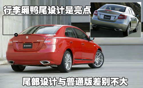 性感的線條運(yùn)用來到車尾,顯眼的行李廂鴨尾設(shè)計(jì),成為Kizashi車尾的焦點(diǎn)所在。而線條豐富的保險(xiǎn)杠造型,以及整合左右雙出尾管的獨(dú)特設(shè)計(jì),亦將Kizashi的動(dòng)感精神表露無遺。