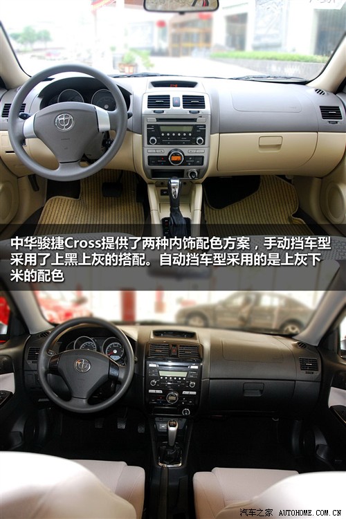 與個性的外觀相比,駿捷Cross在內飾上似乎并沒有體現出什么特點,呈現的一派典型的轎車化風格,做工在自主品牌里面算是比較出色的,而且樣式也絕對不亞于同價位的合資車型,其中手動擋車型采用的是上黑下灰的配色方案,而自動擋車型則為更接近結局的上灰下米的色彩搭配。